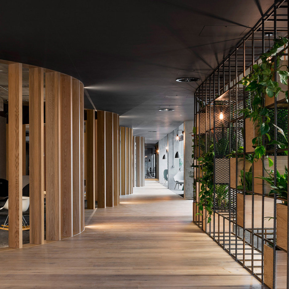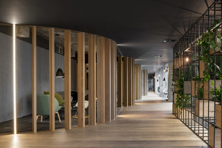Tags:科技公司,沉稳暗色调、橡木与灰色、曲线、城市道路肌理、“街道”主动线、中央集会空间、橡木隔断、螺纹钢筋装饰架、工业风