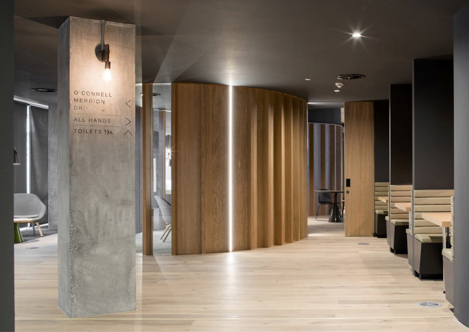 室内的主动线被设想成典型的都柏林街道,蜿蜒流动。这条“街道”是一个充满活力的信息分享公共空间。沿着这条主动线,是星罗棋布的分支路线由路标指向会议室、社交区和工作区等。这些路线均按都柏林真实的道路名来命名。所有的道路最终汇聚在位于中心的全体集会空间,同时这里也是与全球其它办事处联动举办重要发布的活动现场。